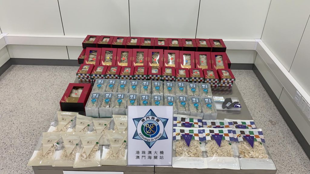 本月4日及5日,海关关员分别截查两名由香港经港珠澳大桥口岸入境澳门的旅客,发现携带的物品有可疑并进行详细检查。在首日涉事旅客的物品内查获约重14公斤干花胶,并在次日涉事旅客的物品内查获1盒鹿尾巴、14包白燕盏丝、20盒燕丝及62盒燕窝,两批货物价值合共港币约70,000元。
