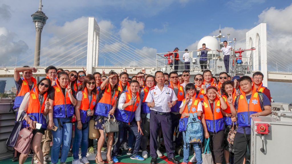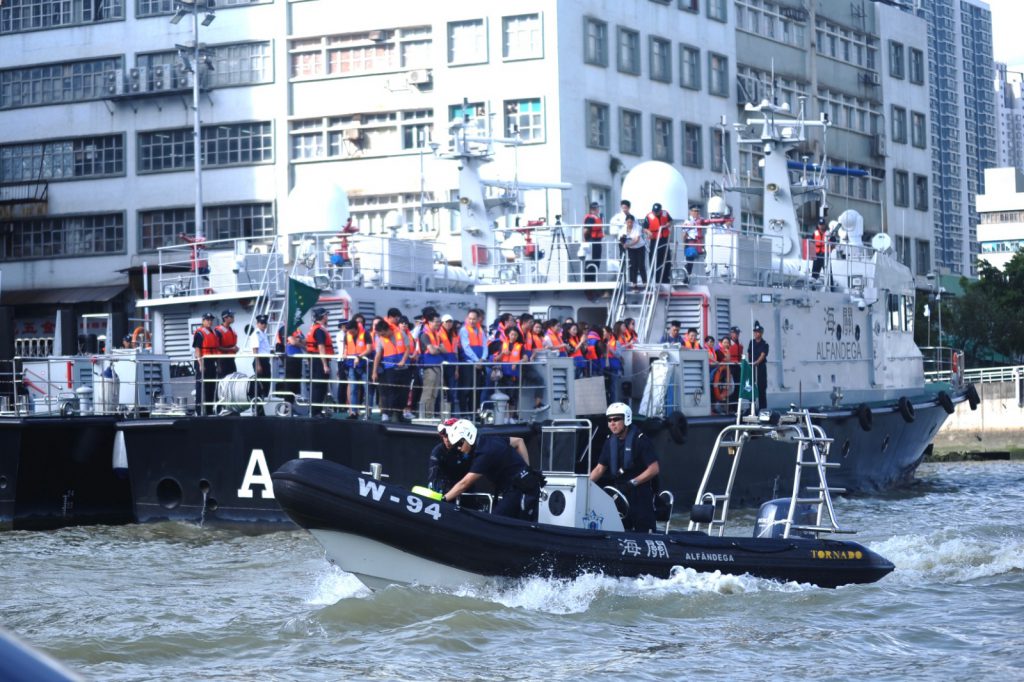 交流活动完结后,海关安排了一场应对海上暴力事件的演练,模拟海关快艇对一艘可疑快艇进行追截,展示如何利用战术驾驶方式截停可疑快艇及应对暴力反抗行动。及后,黄文忠带领一众青年登上海关轮出海,实地了解澳门管理海域范围和海关于海域内的执法管理工作。