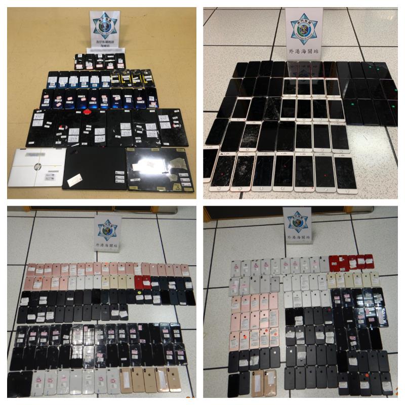 在本月19日及21日,海關人員於上述兩碼頭分別截查了四名形跡可疑的入境旅客,他們均被發現攜有舊的電子產品入境且未能出示有效的入口申報文件。當中在氹仔客運碼查獲25部智能電話、6台平板電腦及3台手提電腦,而外港碼頭則查獲289部智能電話,其中104部及133部分別綁纏在兩名入境旅客的身上。