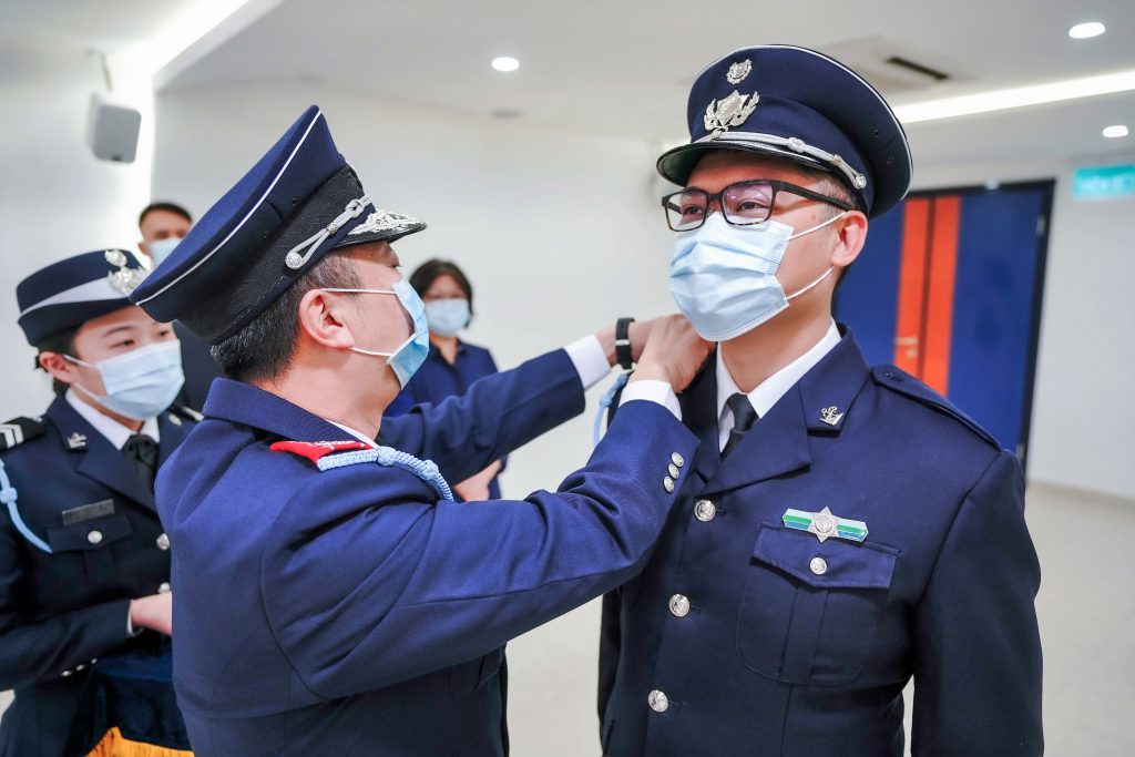 两名获晋升人员在宣誓后,由黄文忠关长为其戴上新肩章,正式晋升成为副关务督察。黄文忠关长于致辞时表示,人才是部门的重要资源,故海关一直重视人才的培养,透过培训及晋升,为积极奋发、有能力、有担当的同事提供更多发展的机会。此外,面对目前新型冠状病毒的疫情,更勉励全体海关人员继续守好岗位,配合抗疫工作,齐心战胜疫症。